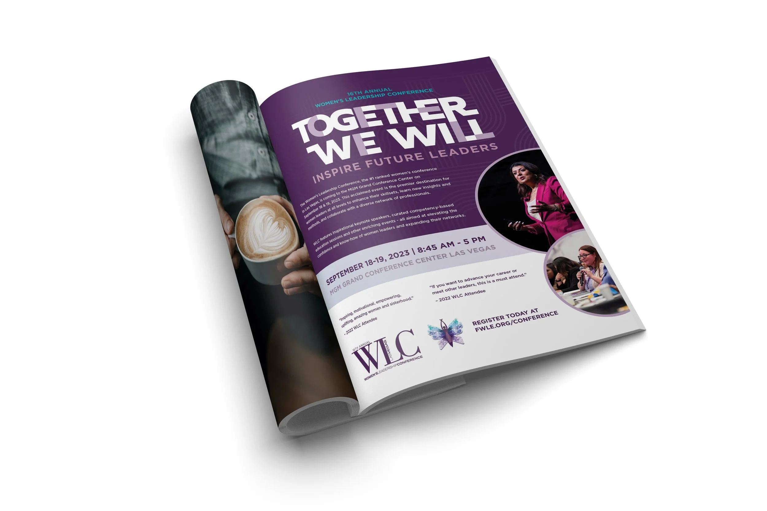 Using a more monochromatic approach on the color palette emphasizes our white and light violet headline. The teal will be used as a small pop of color to draw your eye around the layout. The “Together we will” lock up is designed to show unity and connections as well.